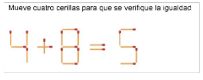 Coge una caja de cerillas y trata de resolver el siguiente reto lógico ‘fisicamente’. Es decir, disponiendo las cerillas sobre la mesa tal cual y moviendo a continuación las cuatro necesarias para que se verifique la igualdad. Pero con una dificultada añadida. Una vez que tengas clara la respuesta, tendrás que manipular las cerillas con los ojos cerrados. Cronometra cuánto tiempo necesitas para resolver este reto cognitivo-manipulativo.