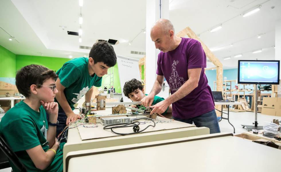 Con el equipamiento de los Laboratorios César a su disposición y Pablo Aliaga e Inmaculada Barcenilla como tutores «que no enseñamos sino que ayudamos a aprender», han desarrollado sus proyectos en grupos de 12. Todo bajo la premisa Diwo, es decir, ‘do it with others’, hazlo con otros, donde, señala Aliaga, «hay más cooperación que competitividad, porque no a todos se nos da bien programar, diseñar o montar, pero juntos hacemos el proyecto más rico». Para él, la filosofía maker aporta a la educación que los chavales «no se conformen con lo que tienen, que, en vez de estar pegados al móvil en el sofá, les demos herramientas para crear lo que quieran, equivocándose al crear: el fracaso es un paso». La principal batalla «es contra el ‘yamismismo’, hacerles ver que en el mundo maker no puedes pagar lo que quieres con dinero, sino con conocimiento, porque cuesta esfuerzo sentarse a desarrollar». ¿Y qué hacen estos jovencísimos makers? «Piensan en juguetes, en cosas para jugar ellos y divertirse, más que en cómo solucionar problemas».